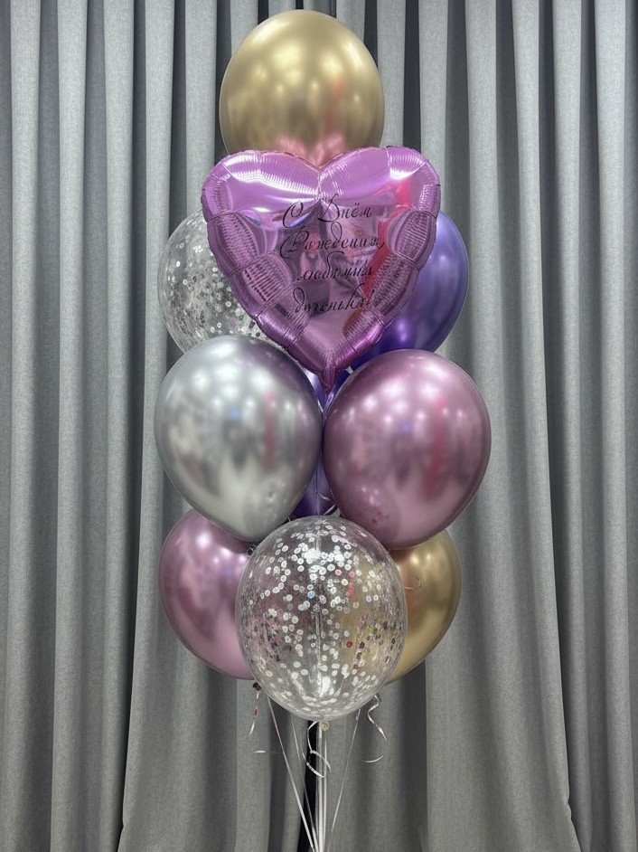 фонтан из 10 шаров ( 2 с конфетти, 7 хром, фольгированный шар с индивидуальной надписью )